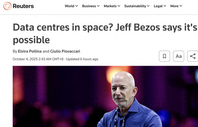 [环球网科技综合报道]10月4日消息,据路透社报道称,由于地球上的数据中心对用于冷却服务器的电力和水的需求增加,轨道数据中心的概念得到了科技巨头的青睐。日前亚马逊创始人杰夫·贝索斯预测,未来10到20年内在太空建造千兆瓦级数据中心。